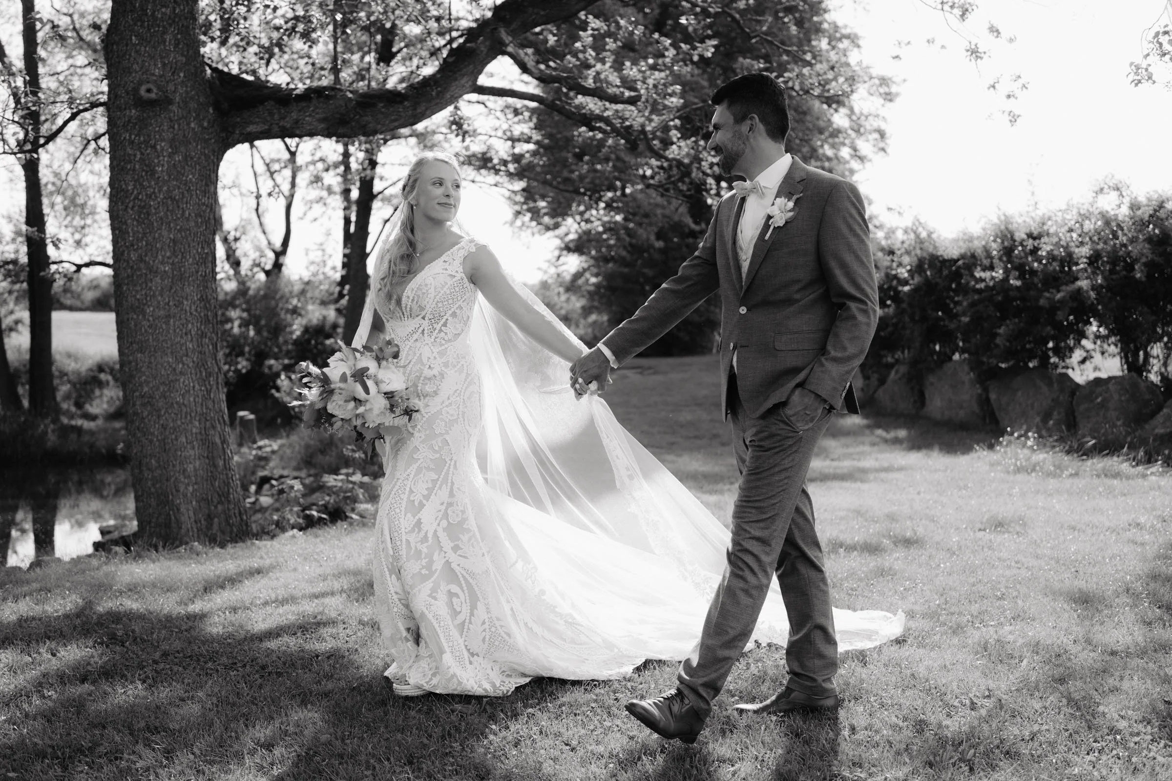 Die traumhafte Boho-Hochzeit von Vici und Dirk fand an einem herrlich sonnigen Tag im Schellenberghof in Leubsdorf statt und wir waren für Hochzeitsfotografie und Hochzeitsfilm dabei. Die Location ist einfach der Wahnsinn: eine rustikale Scheune, umgeben von Natur, coolen schottischen Hochlandrindern und einer riesigen Wiese, die perfekt für eine freie Trauung ist. Das Motto der beiden war Boho Chic, und überall strahlten wunderschönes Makramee, elegante weiße Blumen und Pampasgras. Besonders der Blumen-Traubogen hat uns echt umgehauen! Ein absolutes Highlight war Vici’s Ankunft: Dirk und alle Gäste warteten gespannt, als Vici in einem super stylischen Cabrio vorfuhr und diesen Moment zu ihrem machte. Der First Look bei der Trauung war total süß und emotional, genauso wie die restliche Trauung. Und als ganz besonderes Ritual gab’s vor dem Ringtausch noch einen Schnaps. Beim Auslaufen haben sich die beiden dann so richtig feiern lassen und jeden Augenblick genossen. Den Nachmittag haben die Beiden mit ihren Liebsten bei Sekt, Kaffee und Torte verbracht. Zwischendurch haben wir das Brautpaar für ein paar coole Shots entführt – die Bilder mit Retrobrille und Cabrio sind einfach stylisch geworden! Auch die intime Zeit am Traubogen, wo sie sich ihre liebevollen Eheversprechen gaben und die Momente beim Sonnenuntergang waren einfach wunderschön. Später haben wir noch ganz entspannt ein paar Familienbilder gemacht, bevor der Abend in der traumhaft dekorierten Scheune so richtig losging. Das große Highlight des Abends war der atemberaubend schöne Hochzeitstanz. Es war wirklich ein unvergesslicher Tag voller Liebe und Freude!